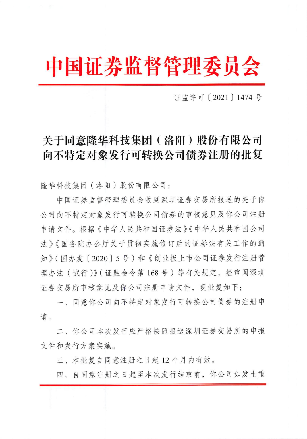 近日,隆華科技收到中國證券監督管理委員會(huì )出具的《關(guān)于同意隆華科技集團(洛陽(yáng))股份有限公司向不特定對象發(fā)行可轉換公司債券注冊的批復》(證監許可〔2021〕1474號)。