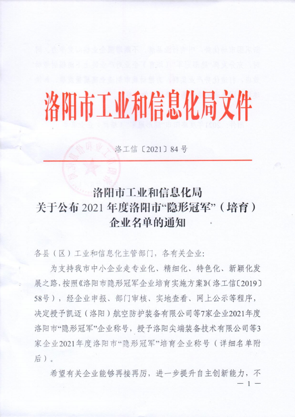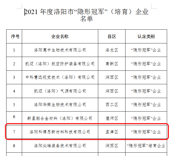 近日,洛陽(yáng)市工業(yè)和信息化局印發(fā)了《關(guān)于公布2021年度洛陽(yáng)市“隱形冠軍”(培育)企業(yè)名單的通知》(【2021】84號),洛陽(yáng)科博思新材料科技有限公司榮獲“隱形冠軍”企業(yè)稱(chēng)號。