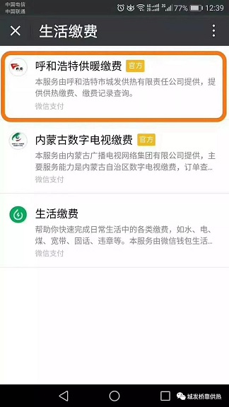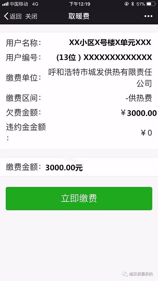 我→錢(qián)包→城市服務(wù)→便民服務(wù)→生活交費→呼和浩特城發(fā)供暖交費(官網(wǎng))→按提示操作: