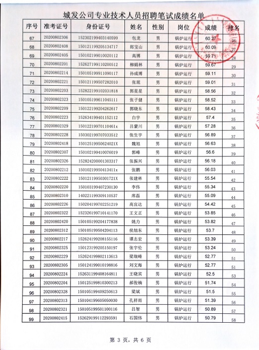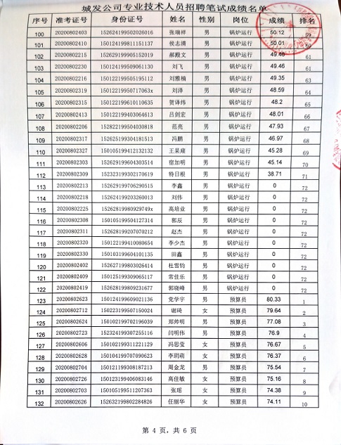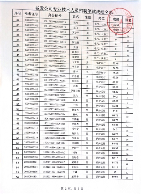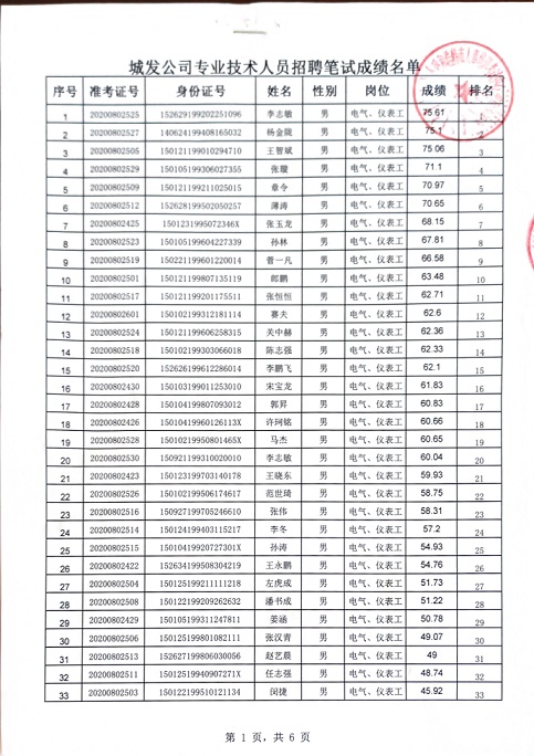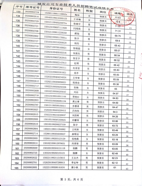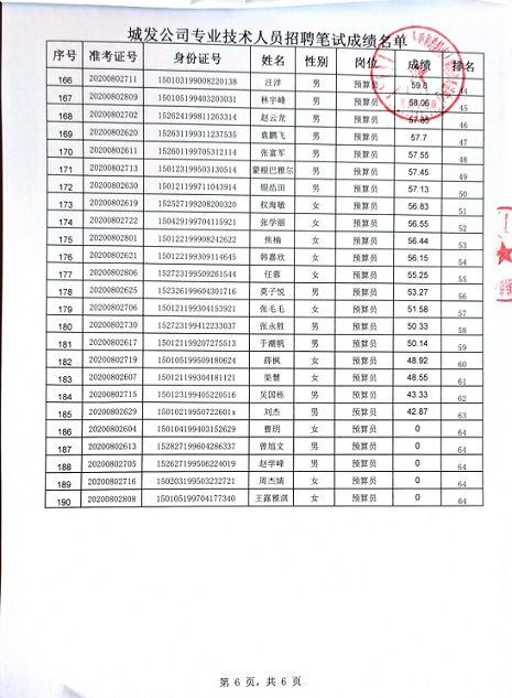 2020年城發(fā)公司專(zhuān)業(yè)技術(shù)人員招聘筆試成績(jì)名單