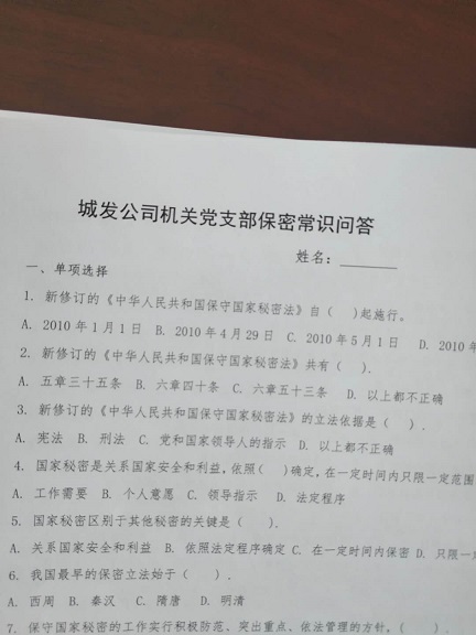 還集中進(jìn)行了保密教育。為進(jìn)一步推動(dòng)保密和密碼工作現行方針、政策、法律法規學(xué)習宣傳活動(dòng),增強廣大黨員干部群眾的保密意識、保密法制觀(guān)念和強化密碼法的學(xué)習宣傳,黨支部通過(guò)發(fā)放解答“城發(fā)公司機關(guān)黨支部保密常識問(wèn)答”100題的考卷,進(jìn)行了“忠誠干凈、踐行使命,法在心中、法在行中”為主題的《保密法》《密碼法》宣傳教育。